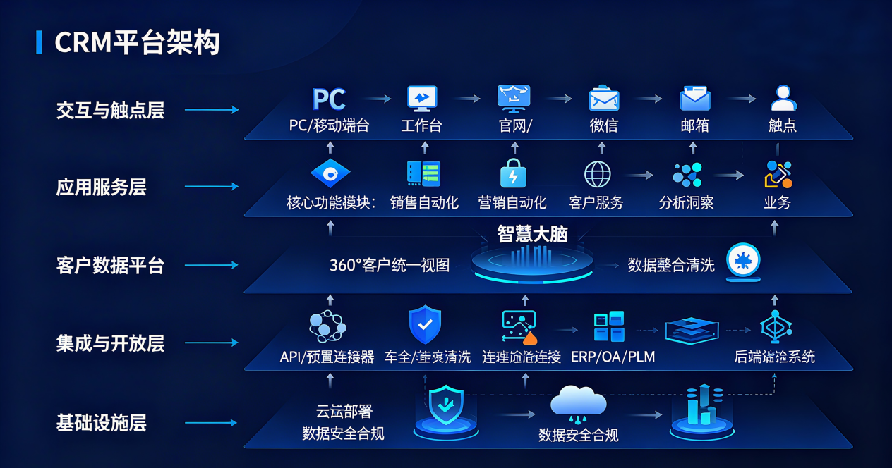 交互与触点层:为销售、客服、市场及管理层提供PC、移动端工作台,并集成官网、微信、邮箱等客户触点。
