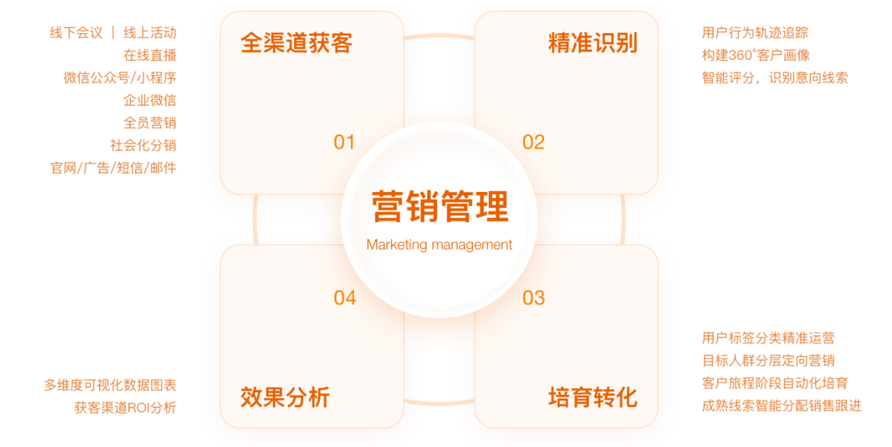 营销自动化与获客:管理市场活动,追踪线索来源,通过线索打分与培育,提升营销投入产出比,赋能销售前线;