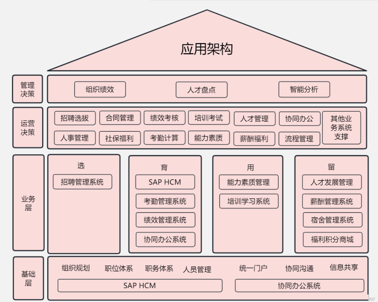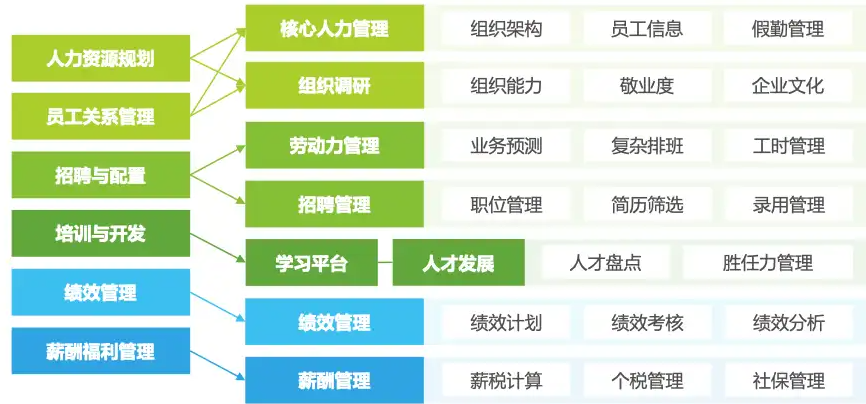 应用服务层(核心功能):包含核心人事、薪酬福利、绩效管理、人才发展、招聘培训等全功能模块;