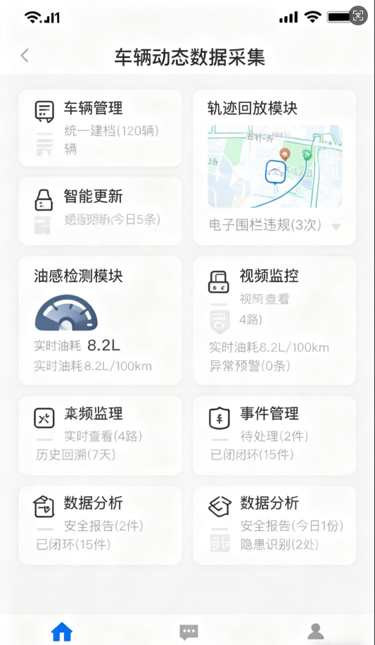 智能油感检测:精准防控燃油损耗,针对物流运输、工程作业等领域普遍存在的燃油被盗、虚报油耗等问题,搭载智能油感检测系统,通过高精度油位传感器实时采集油箱油位数据,结合车辆行驶状态(怠速、行驶、停车),通过AI算法精准分析燃油消耗趋势,识别异常油耗行为(如偷油、漏油、虚开发票等)。当检测到油位异常下降时,立即触发报警并同步推送至管理后台与管理人员手机端,同时记录异常发生时间、地点与油位变化数据,为燃油管控提供精准依据。传感器采用防篡改设计,具备抗高温、抗振动、抗干扰能力,适配不同类型油箱,展现出公司在传感技术与数据算法融合应用的核心优势。