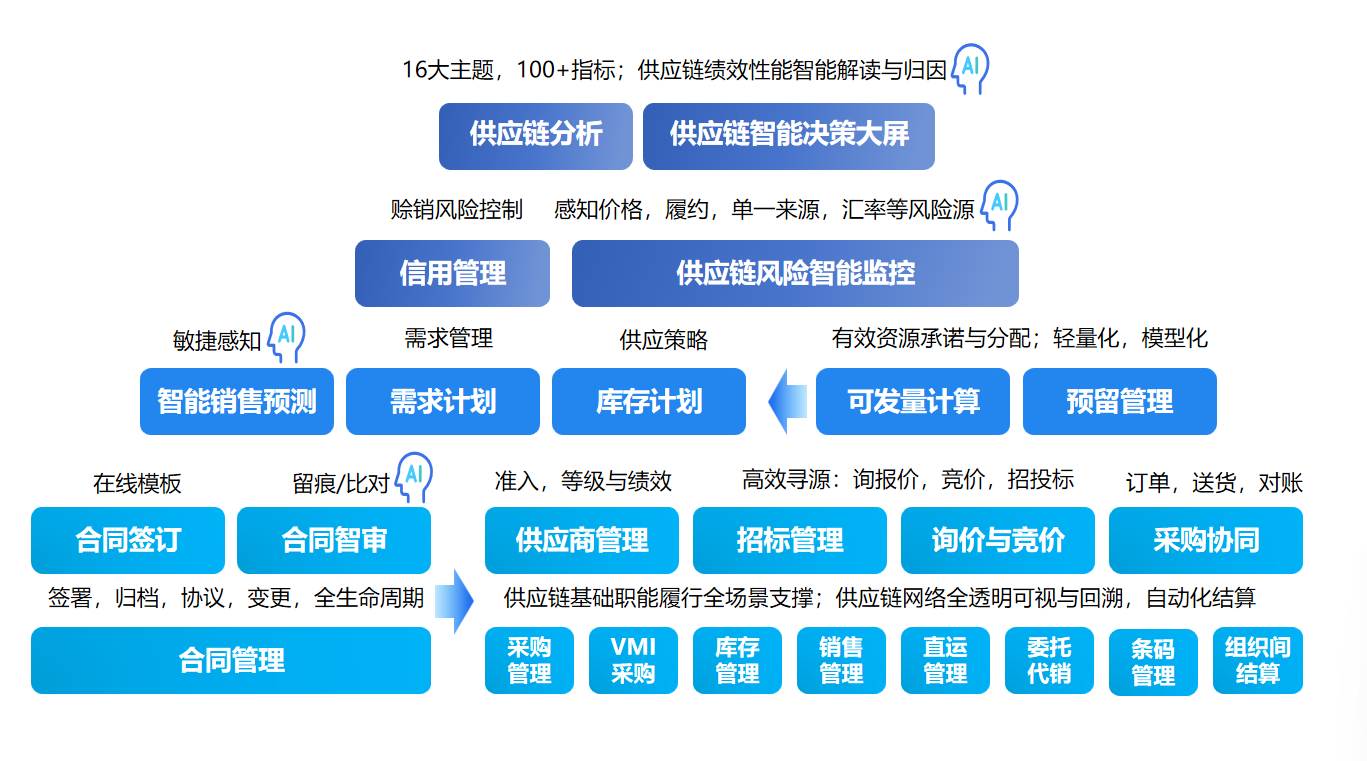 打通采购、库存、销售全链条,实现供应链高效协同与可视化管控,包括:采购管理,供应商管理、采购计划、采购订单、询价报价、收货验收、付款结算等;库存管理,库存实时监控、出入库管理、批次管理、库位管理、库存盘点、库存预警等;销售管理,客户管理、销售计划、销售订单、发货管理、收款结算、销售分析等;供应链协同,供需平衡分析、订单跟踪、上下游数据共享(如供应商门户、客户门户)等。