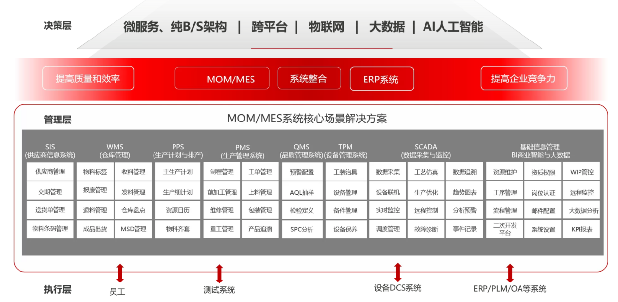 应用服务层(核心功能):包含生产调度、工时管理、质量追溯、设备监控等核心应用模块,组件化设计,灵活配置;